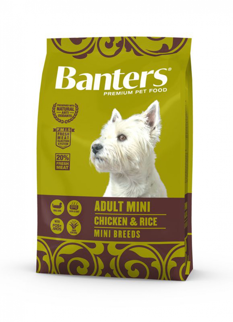 A Visán Banters Dog Adult Mini Chicken & Rice ideális választás kis termetű (1-10 kg) felnőtt kutyáknak 10 hónapos kortól 8 éves korig. A krokettek mérete és ropogós szerkezete kifejezetten a kis testméretű kutyáknak lett kifejlesztve, hogy a tápszem rágása könnyű és kellemes legyen. Probiotikumok segítik a bélflóra egyensúlyának fenntartását és a megfelelő emésztést. Omega zsírsavak, cink és A-vitamin támogatja a bőr és szőrzet egészségét, valamint a bunda fényességét.
