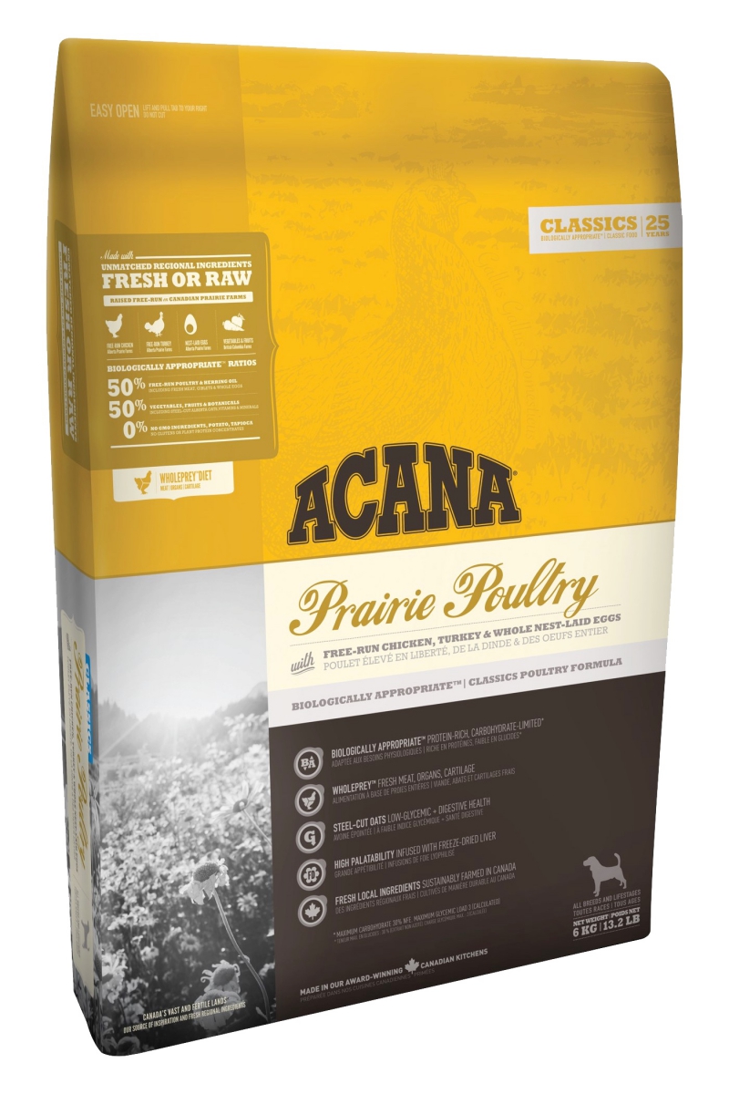 A mai kutyák nemcsak képesek megenni őseik táplálékát, hanem szükségük is van rá a kiváló egészségi állapot fenntartásához. Ezért készül az ACANA Prairie Poultry friss* és dehidratált csirkéből, csirkezsírből és halolajból, mely a hosszú láncú Omega 3 zsírsavak forrása. Az ACANA Prairie Poultry fő szénhidrátforrásként alacsony glikémiás gyöngyárpát, borsót és zabot tartalmaz, ezért az állat vércukorszintje stabil marad, az elhízás kockázata pedig csökken.