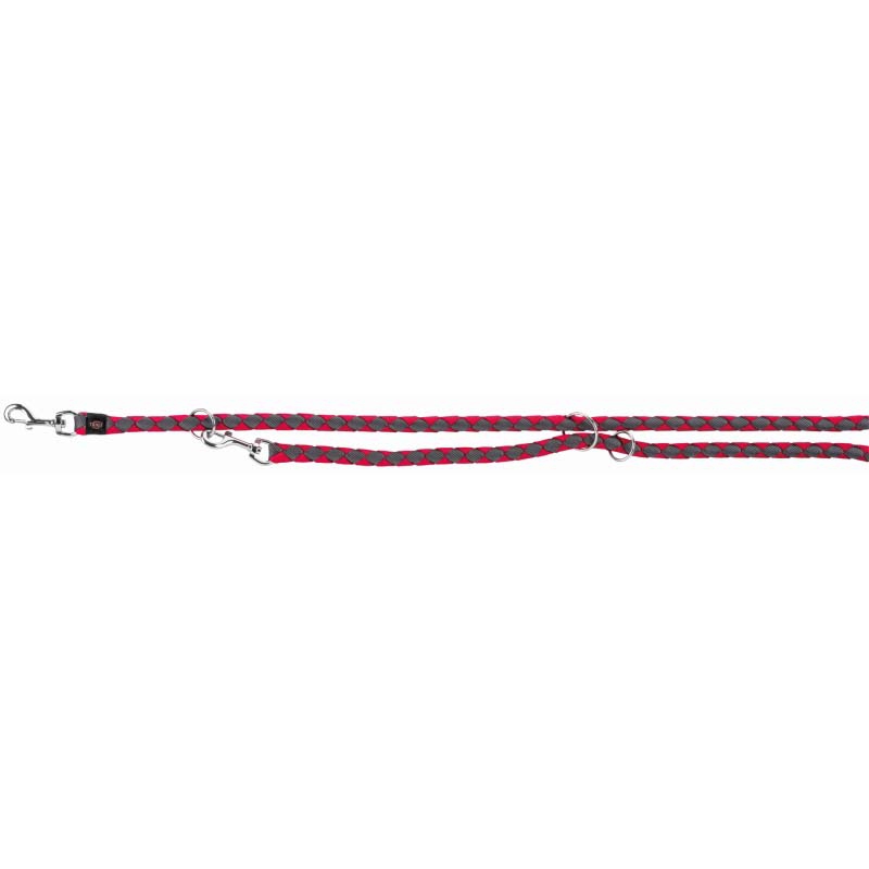 A Trixie Cavo a két végén karabinerrel ellátott, rombuszmintás, három fokozatban szabályozható hosszúságú, kör keresztmetszetű nylonszalagokból fonott kutyapóráz.