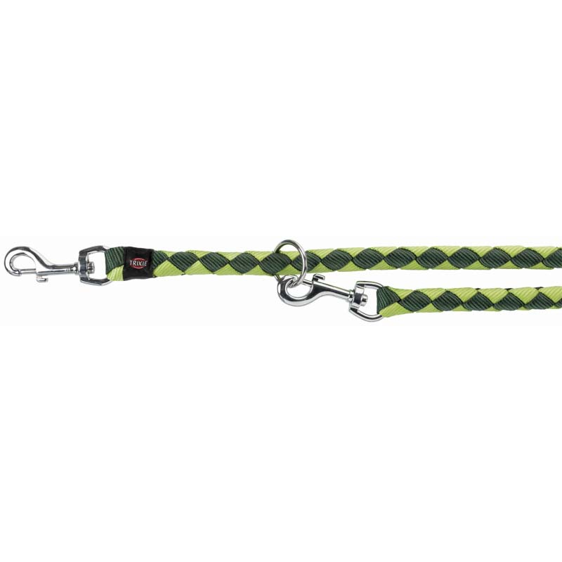 A Trixie Cavo a két végén karabinerrel ellátott, rombuszmintás, három fokozatban szabályozható hosszúságú, kör keresztmetszetű nylonszalagokból fonott kutyapóráz.