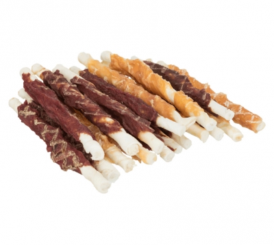 marha-, bárány- vagy csirkehús (45%), nyersbőr, burgonyakeményítő, növényi fehérje, glicerin.