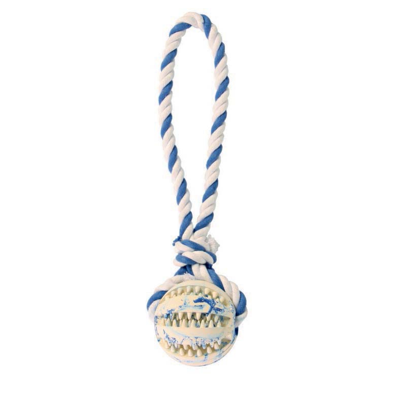 A menta ízesítésű természetes gumilabda hatásosan masszírozza az ínyt és tisztítja a fogakat, fogközöket az apró redőknek köszönhetően. A labdára csomózott kötéllel könnyen elhajíthatja, vagy kötélhúzáshoz is használhatja. Tökéletes választás az erő összeméréséhez és a játékra ösztönzéshez. Kedvence különösen élvezni fogja a játékot. Használat előtt rendszeresen ellenőrizze azt. Ha hibásnak találja, akkor kedvence biztonsága érdekében mielőbb cserélje ki.