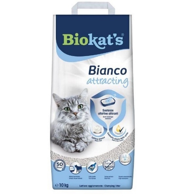 Biokats Bianco Attracting macskaalom – hófehér, illatósított alom, amely a macskavécét az állat számára vonzóvá teszi. A természetes agyagalom tovább marad higiénikus és friss, így ember és állat egyaránt jól érzi magát.