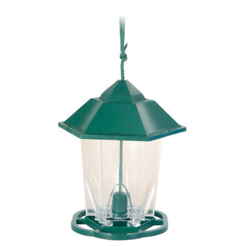 Felakasztható, időjárásálló műanyag madáretető, amelyet a madarak hamar elfogadnak és felkeresnek. A nagy méretű tető megóvja a felkínált magokat az időjárás viszontagságaitól.