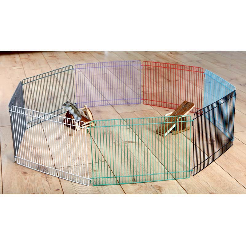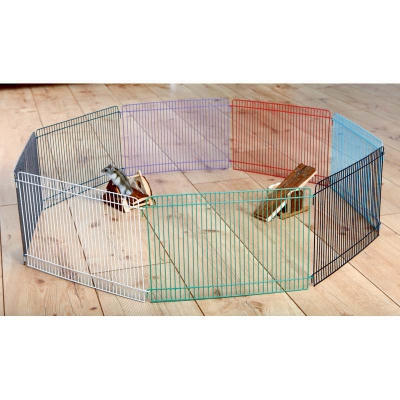 Egyszerűen egymásba illeszthető, 34 cm x 23 cm-es, horganyzott színes fémelemekből készült, könnyedén bővíthető beltéri kifutó hörcsögöknek, egereknek, tengerimalacoknak, szárazföldi teknősöknek vagy más kisrágcsálóknak. Az összeszerelt ketrec belső átmérője 86 cm.