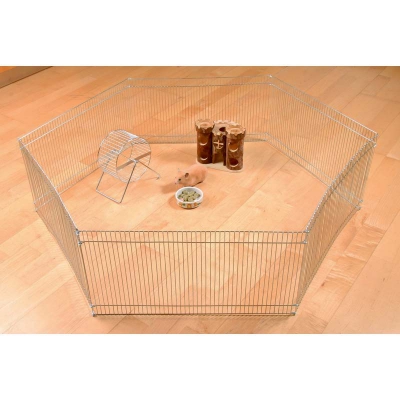 Egyszerűen egymásba illeszthető, 48 cm x 25 cm-es, horganyzott fémelemekből készült, könnyedén bővíthető beltéri kifutó hörcsögöknek, egereknek, tengerimalacoknak, szárazföldi teknősöknek vagy más kisrágcsálóknak. Az összeszerelt ketrec belső átmérője 90 cm.
